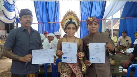 Bapak Gede Kardiana selaku Perbekel Pacung menyerahkan secara langsung Akta Perkawinan dan Kartu Keluarga kepada Sepasang Pengantin Baru yang merupakan realisasi dari salah satu Inovasi Disdukcapil Buleleng yakni NYAKSI ( Menyerahkan Akta Saat Acara Resepsi).