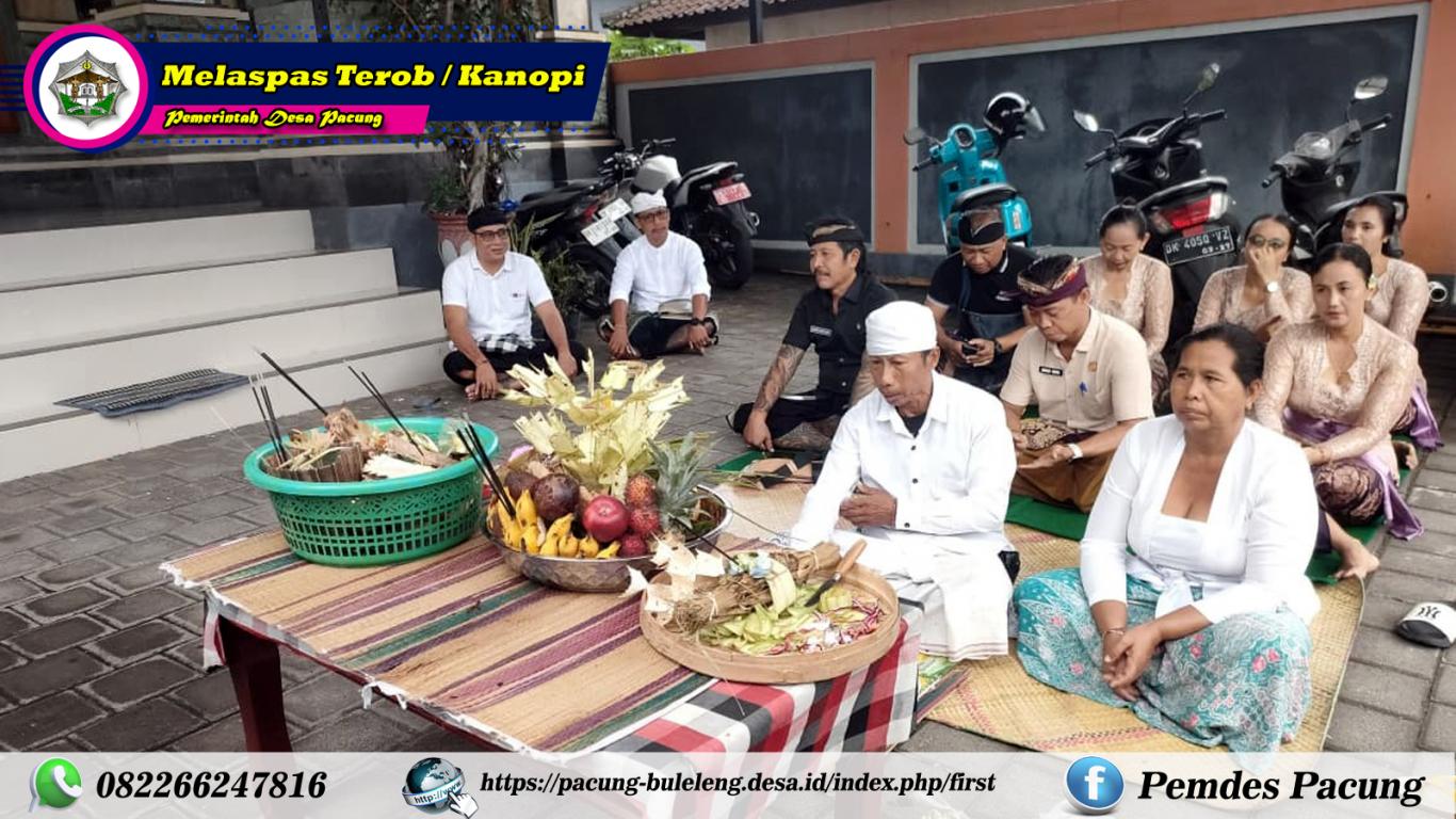 Inggihan Bakti Pamelaspas punika prasida katur melarapan pemargi mekarya Terob/Kanopi ring kantor sampun puput. Kawekasang olih Dane Jro Mangku Ketut Sulaba, parikrama pamelaspas sane kekawitin saking galah 08.00 witta puniki astungkara prasida memargi antar, taler parikrama puniki karuntutin antuk sembah bakti olih Bapak Perbekel lan Angga Staf Pemdes Pacung mekasami.