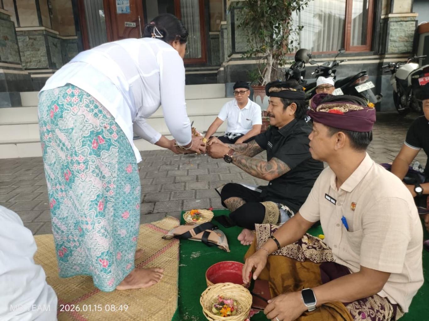 Ring Dina sane becik sekadi mangkin, nuju Dina Wraspati Paing Wuku Tambir, Pemerintah Desa Pacung Ngelaksanayang Upacara Pamelaspas ring Kantor Perbekel Desa Pacung, (15/1).